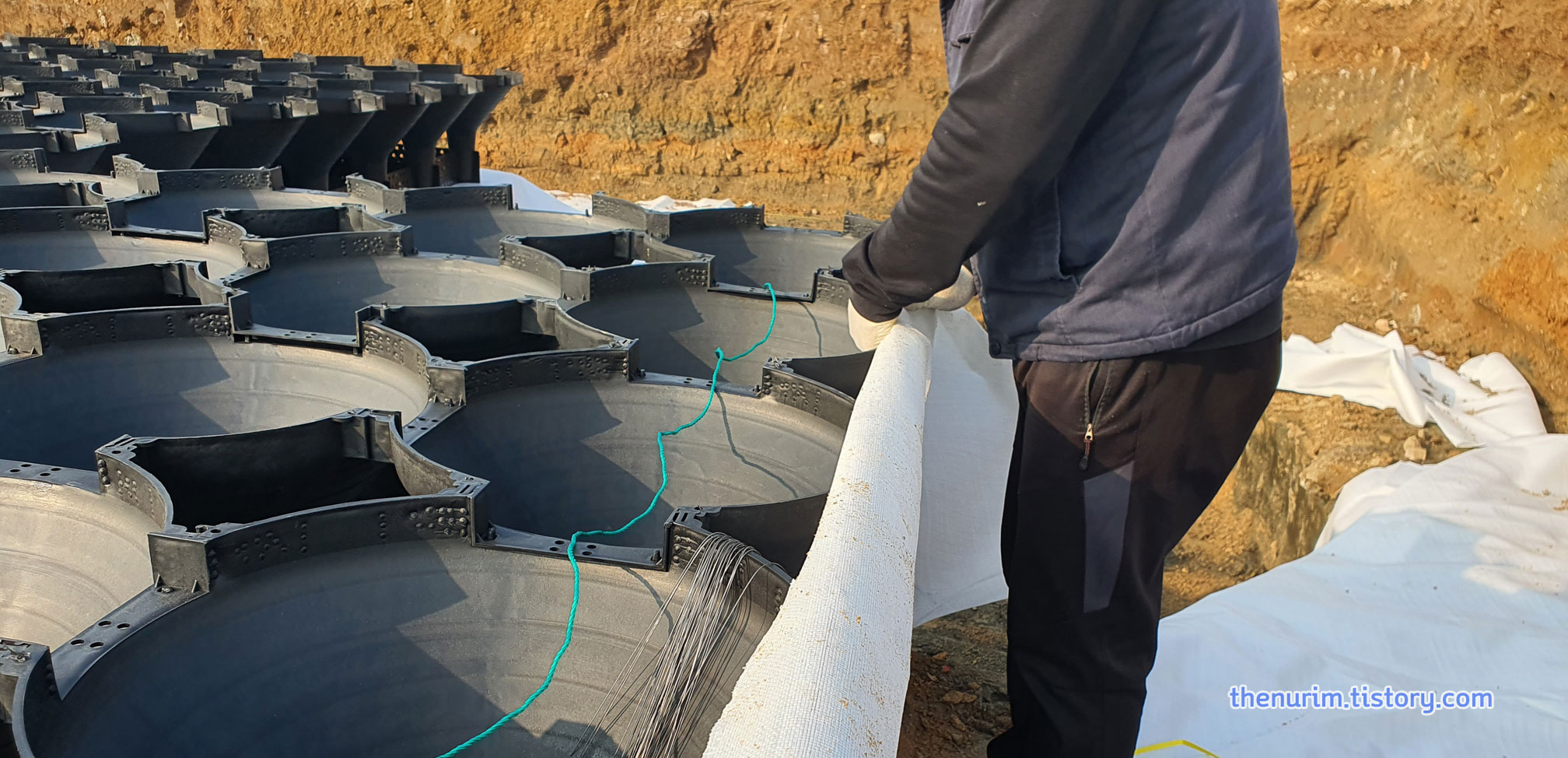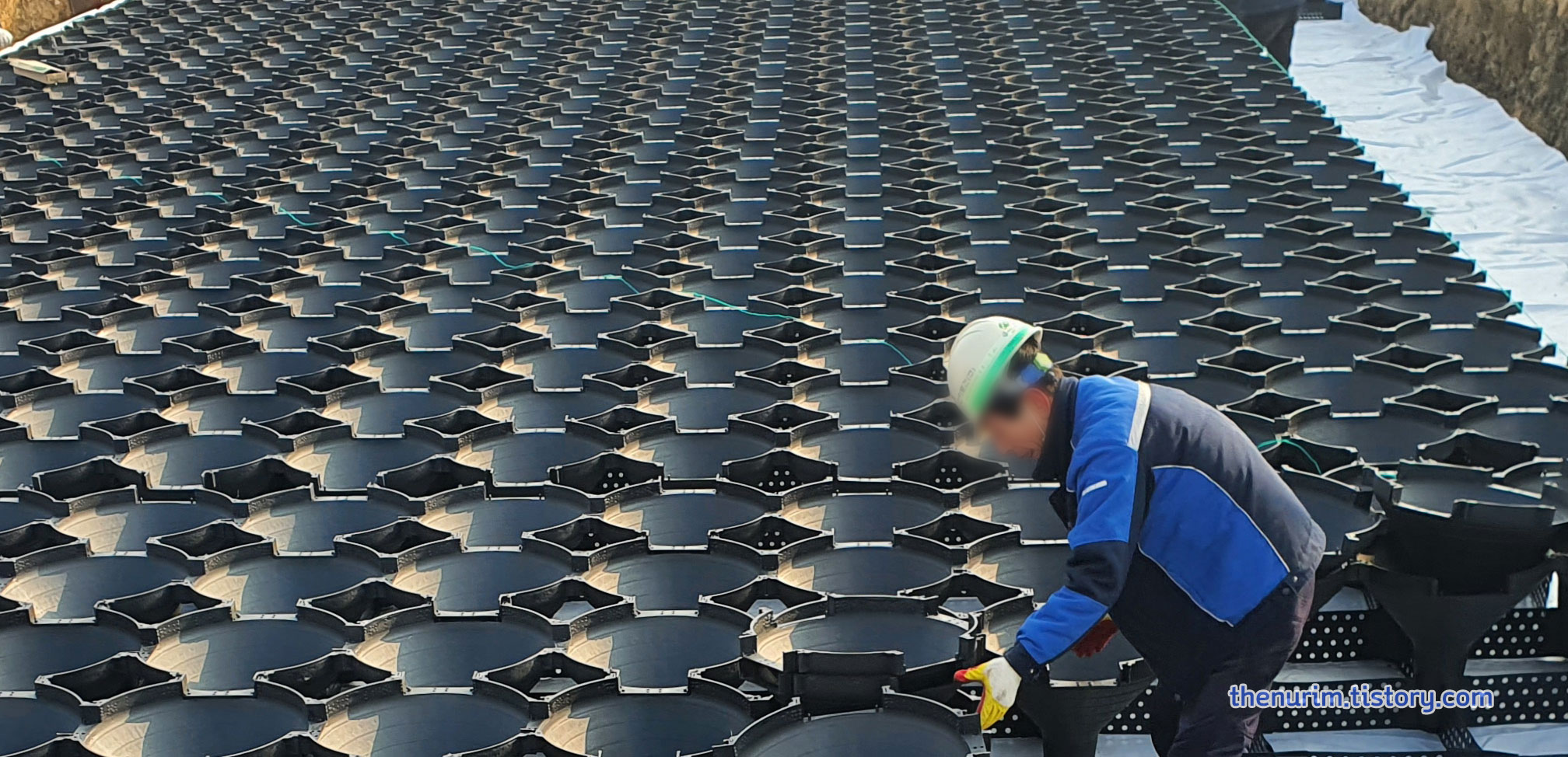 먼저 흰매트를 깔고 지오메시를 설치한 다음 팽이기초의 주자재인 팽이용기를 가지런히 붙여서 조립합니다. 그런 다음 팽이를 결속선과 끈을 이용해 사방 테두리를 단단히 고정하고요.