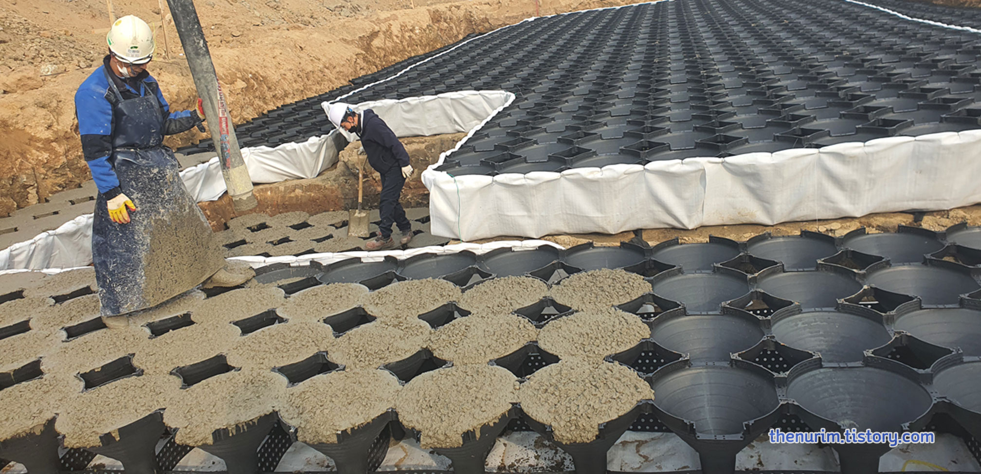 예전에는 삼각형 깔때기 모양의 팽이 위에 철근을 올려 보강을 했는데, 요즘에는 지오메시(팽이용기 아래에 긴결하는 자재)를 사용해 시공합니다.