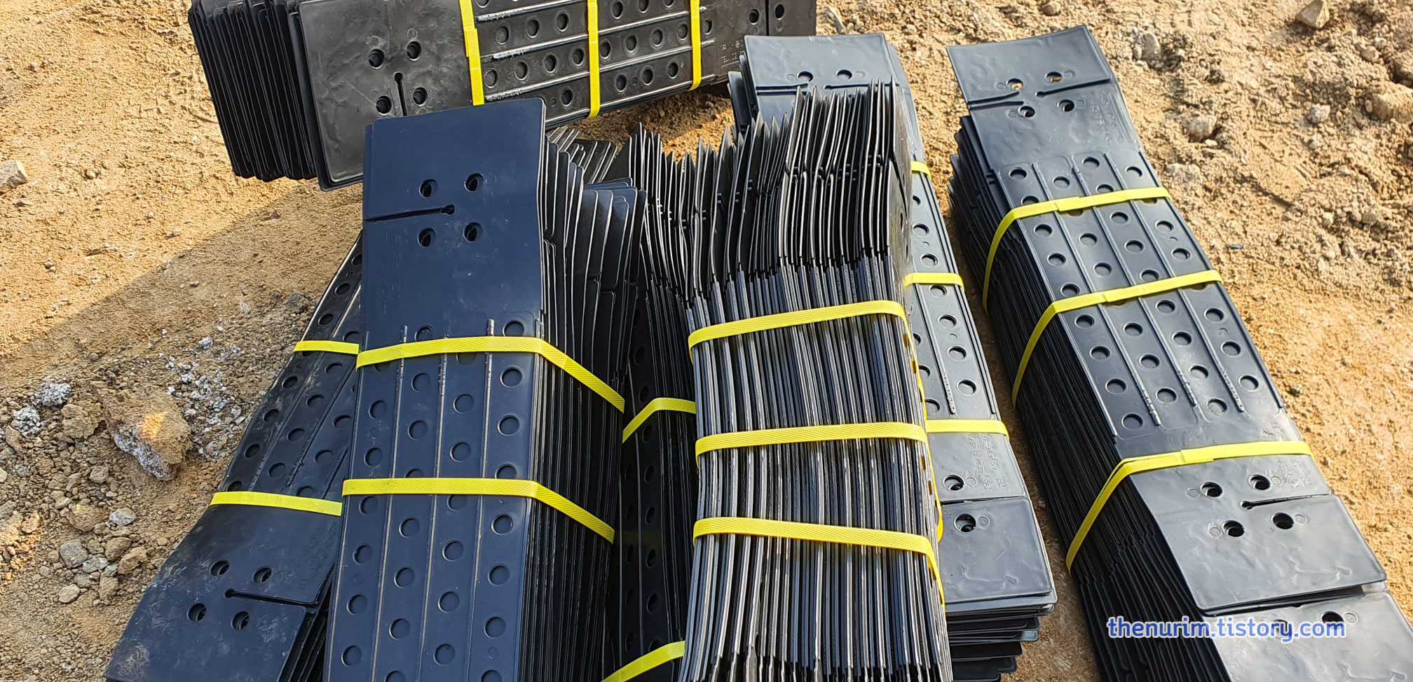 예전에는 삼각형 깔때기 모양의 팽이 위에 철근을 올려 보강을 했는데, 요즘에는 지오메시(팽이용기 아래에 긴결하는 자재)를 사용해 시공합니다.