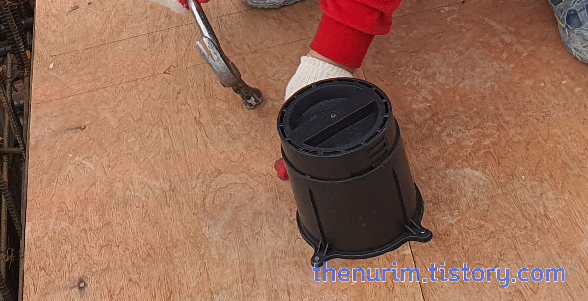 관통슬리브란 배관이 지나갈 자리를 미리 타설 전에 설치해 두어, 나중에 제거하고 그 곳에 화장실 배관을 설치하게 됩니다. 슬리브를 고정하고, 슬라브 두께 만큼 속대를 올려주면 됩니다. 옆에 치수가 표기되어 있으니, 가령 슬라브 두께가 150이라면, 겉대에 150 숫자에다가 돌려 물리면 높이가 딱 맞게 고정됩니다.