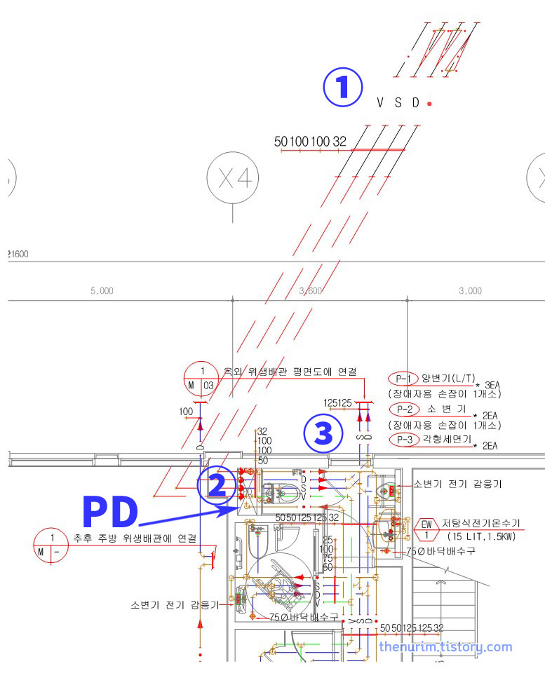 ① VSDㆍ : V는 Vent 통기관 50mm / S는 Soil 대소변 100mm / D는 Drain 잡배수 (대소변 제외한 오수) 100mm, 끝으로 점(ㆍ) 하나 표기되어 있는 것은 급수관을 의미하는 것으로 32mm로 잡혀있네요. 또한 길게 표시되었고 화살표 방향으로 봐서 S, D 즉 대소변과 잡배수는 윗층에서 내려오고, 급수관은 화살표가 위로 향하니 올려주는 것이죠.