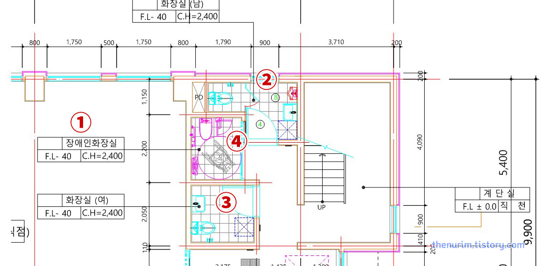 ① F.L -40, C.H=2,400 : FL은 Floor Level로 최종바닥 마감입니다. 따라서 -40이므로, FL에서 40mm 다운시켜 화장실 바닥을 시공하라는 의미입니다. 그리고 C.H는 Ceiling Height의 약어로 말그대로 화장실 천장 높이를 이르고 여기서는 2,400mm 이니 2.4미터의 반자높이로 시공하면 되겠네요. 타일팀이 맨먼저 물어오는 것이 이 화장실 높이입니다.